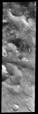 Note: this THEMIS visual image has not been radiometrically nor geometrically calibrated for this preliminary release. An empirical correction has been performed to remove instrumental effects. A linear shift has been applied in the cross-track and down-track direction to approximate spacecraft and planetary motion. Fully calibrated and geometrically projected images will be released through the Planetary Data System in accordance with Project policies at a later time.