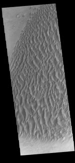 This VIS image displays sand dunes within Proctor Crater. These dunes are composed of basaltic sand that has collected in the bottom of the crater. The topographic depression of the crater forms a sand trap that prevents the sand from escaping. Dune fields are common in the bottoms of craters on Mars and appear as dark splotches that often lean up against the downwind walls of the craters. Dunes are useful for studying both the geology and meteorology of Mars. The sand forms by erosion of larger rocks, but it is unclear when and where this erosion took place on Mars or how such large volumes of sand could be formed. The dunes also indicate the local wind directions by their morphology. In this case, there are few clear slipfaces that would indicate the downwind direction. The crests of the dunes also typically run north-south in the image. This dune form indicates that there are probably two prevailing wind directions that run east and west (left to right and right to left). Proctor Crater is located in Noachis Terra and is 168 km (104 miles) in diameter.
