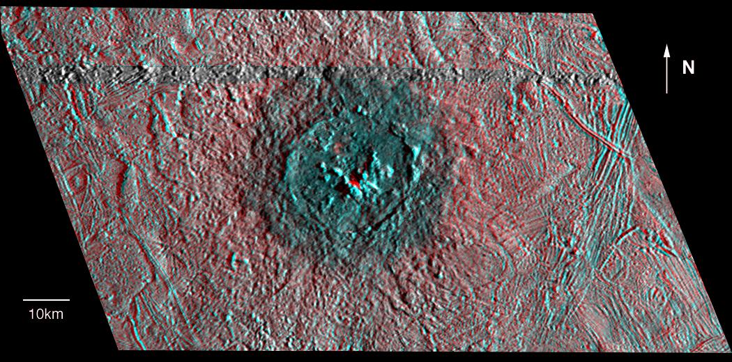 The anaglyph shows Pwyll crater on Jupiter's icy satellite Europa. The crater is about 26 kilometers (16 miles) across and has a central peak which rises approximately 600 meters (almost 2,000 feet) above the crater floor. The heavily degraded rim reaches a height of only 300 meters. A central peak that is higher than the crater rim is unusual among other craters in the Solar System. A continuous ejecta blanket around the impact structure rises above the surrounding landscape and is at about the same topographic level as the crater floor. The Pwyll impact appears to have occurred on a northwest to southeast (upper left to lower right) trending slope.