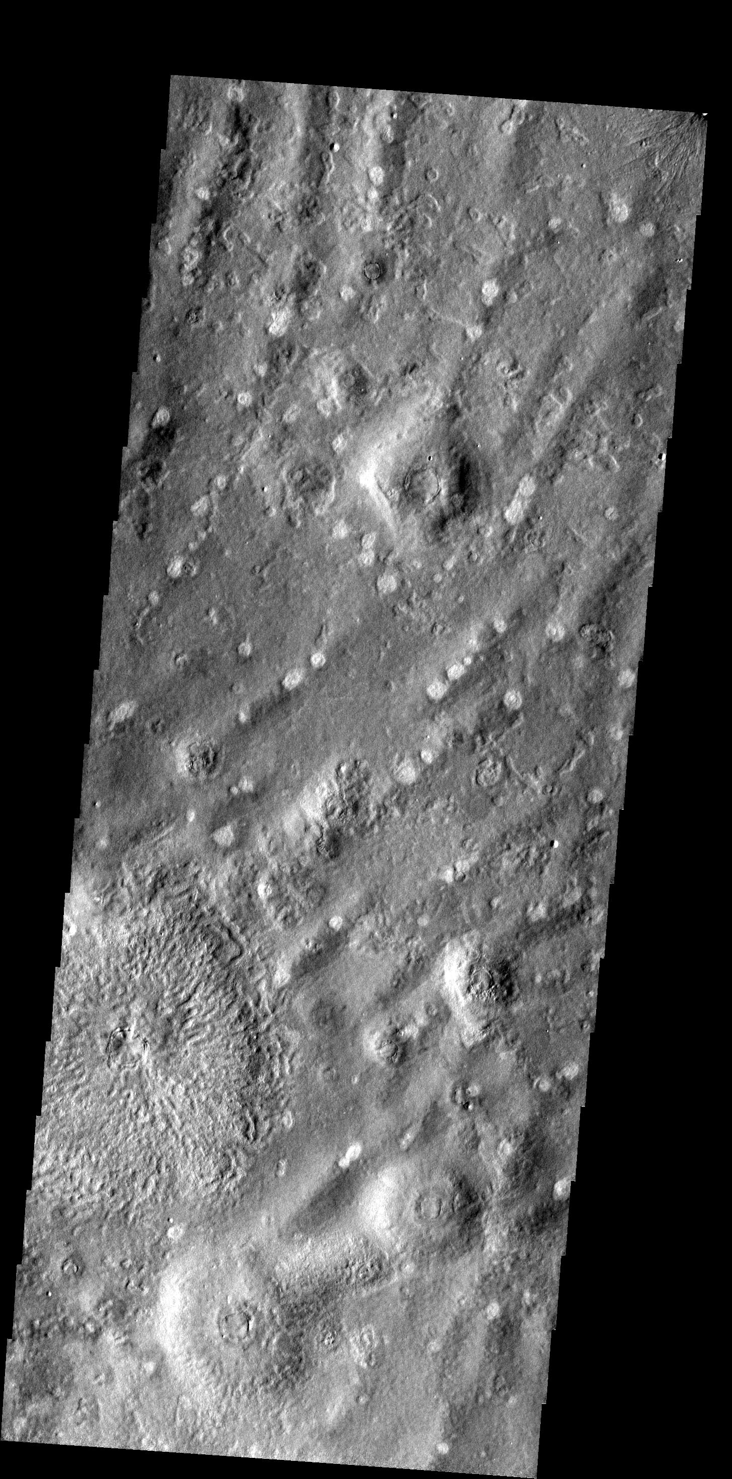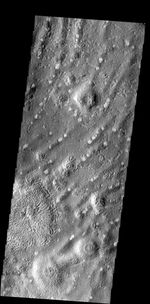 Note: this THEMIS visual image has not been radiometrically nor geometrically calibrated for this preliminary release. An empirical correction has been performed to remove instrumental effects. A linear shift has been applied in the cross-track and down-track direction to approximate spacecraft and planetary motion. Fully calibrated and geometrically projected images will be released through the Planetary Data System in accordance with Project policies at a later time.