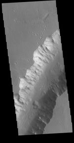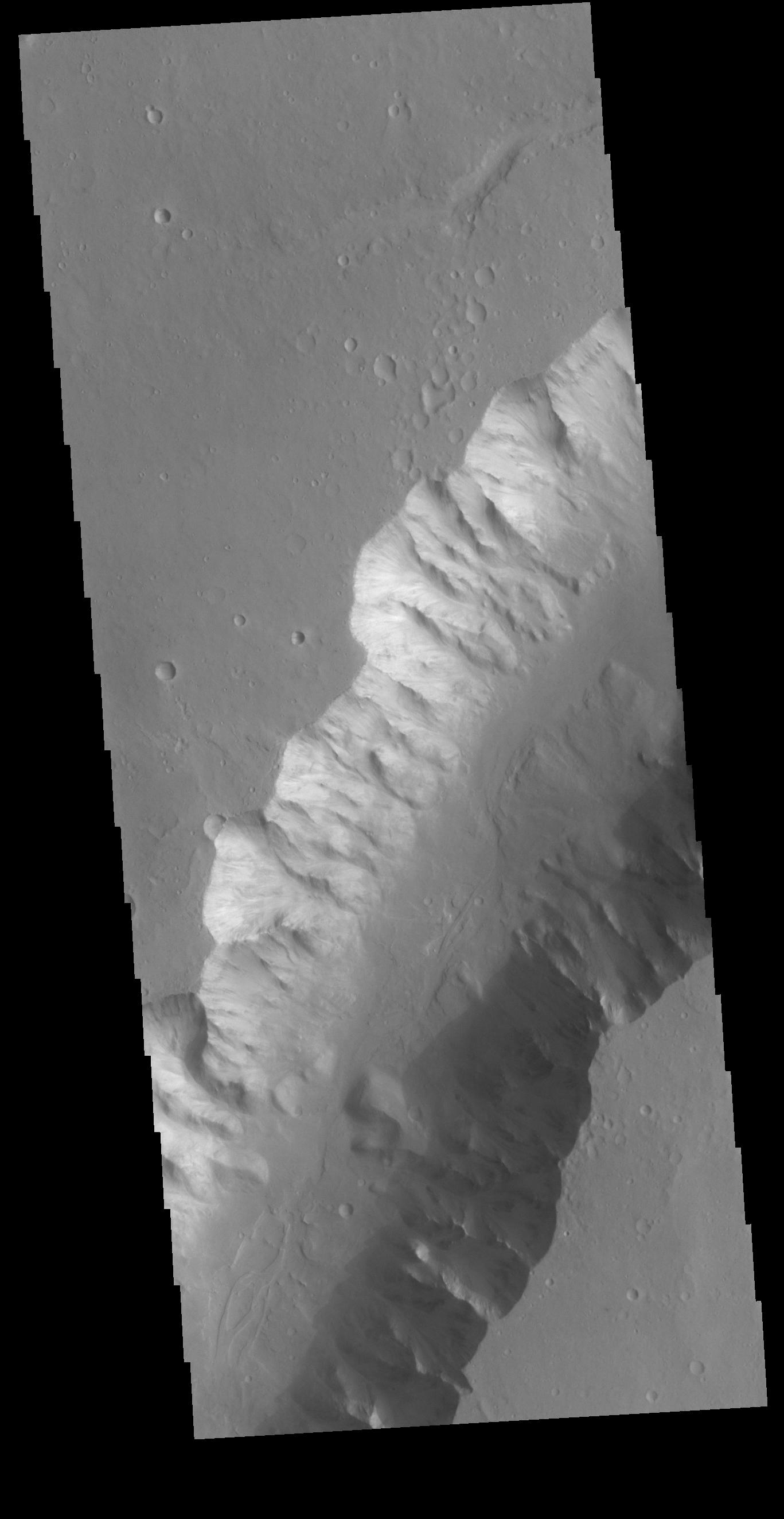 Today's VIS image shows a small section of Shalbatana Vallis. Located in Xanthe Terra, Shalbatana Vallis is an outflow channel carved by massive floods of escaping groundwater whose source lies far to the south of this image. This channel, and all others in this region, drain into Chryse Planitia.