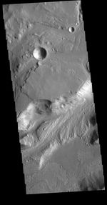 Today's VIS image shows a portion of Shalbatana Vallis. Located in Xanthe Terra, Shalbatana Vallis is an outflow channel carved by massive floods of escaping groundwater whose source lies far to the south of this image. Shalbatana Vallis is over 1300 km long (808 miles). This channel, and all others in this region, drain into Chryse Planitia.