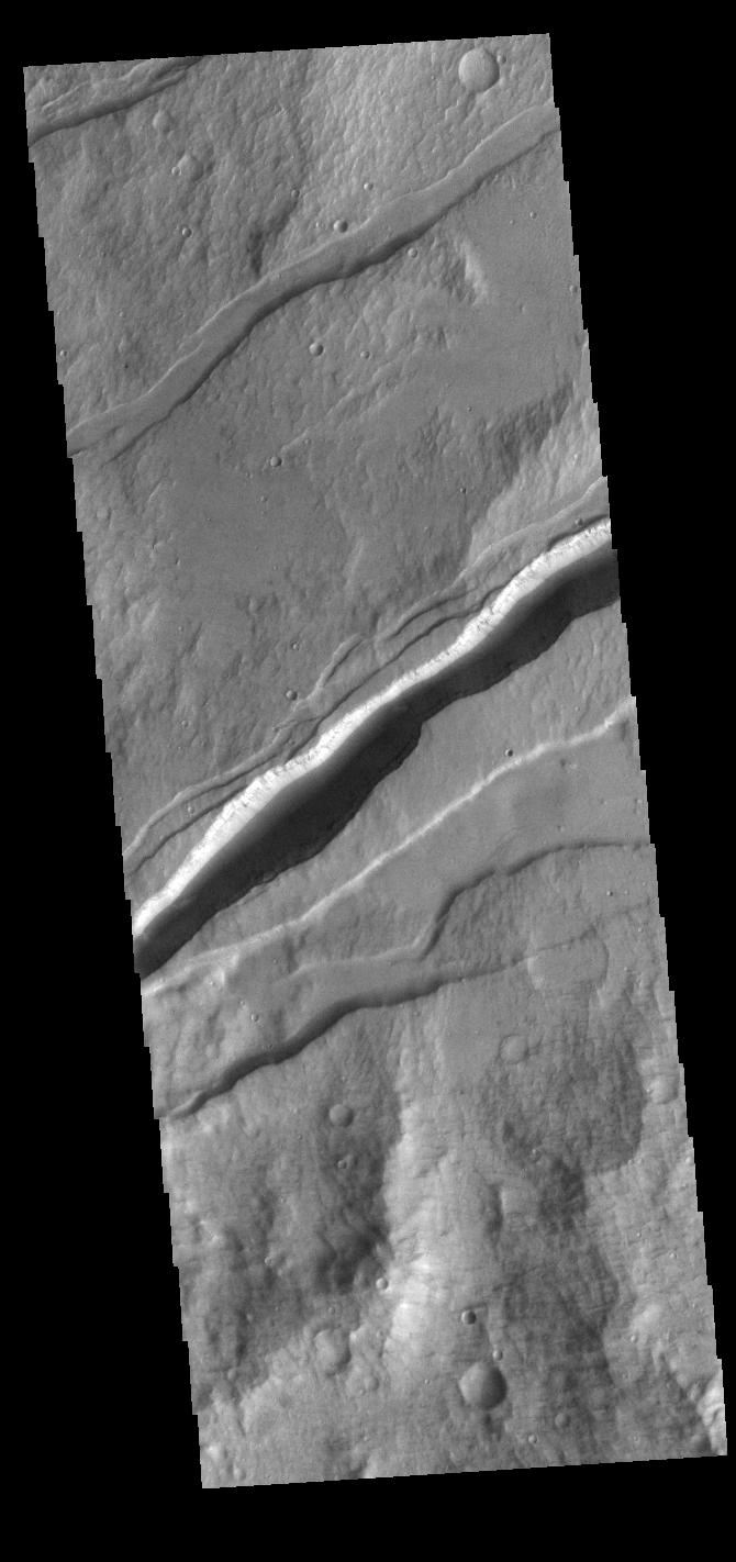 The linear depressions in this VIS image are part of Sirenum Fossae. These depressions are called graben, which form by the down drop of material between two parallel faults. The faults are caused by extensional tectonic stresses in the region. The fossae are 2735km long (1700 miles).
