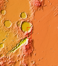 The linear depressions in this VIS image are part of Sirenum Fossae. These depressions are called graben, which form by the down drop of material between two parallel faults. The faults are caused by extensional tectonic stresses in the region. The fossae are 2735km long (1700 miles).