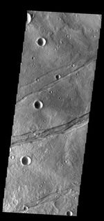 The linear depressions in this VIS image are part of Sirenum Fossae. Depressions of this type are called graben, which form by the down drop of material between two parallel faults. The faults are caused by tectonic stresses in the region. The Sirenum Fossae graben are 2735km (1700 miles) long.
