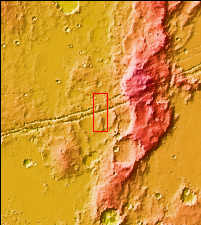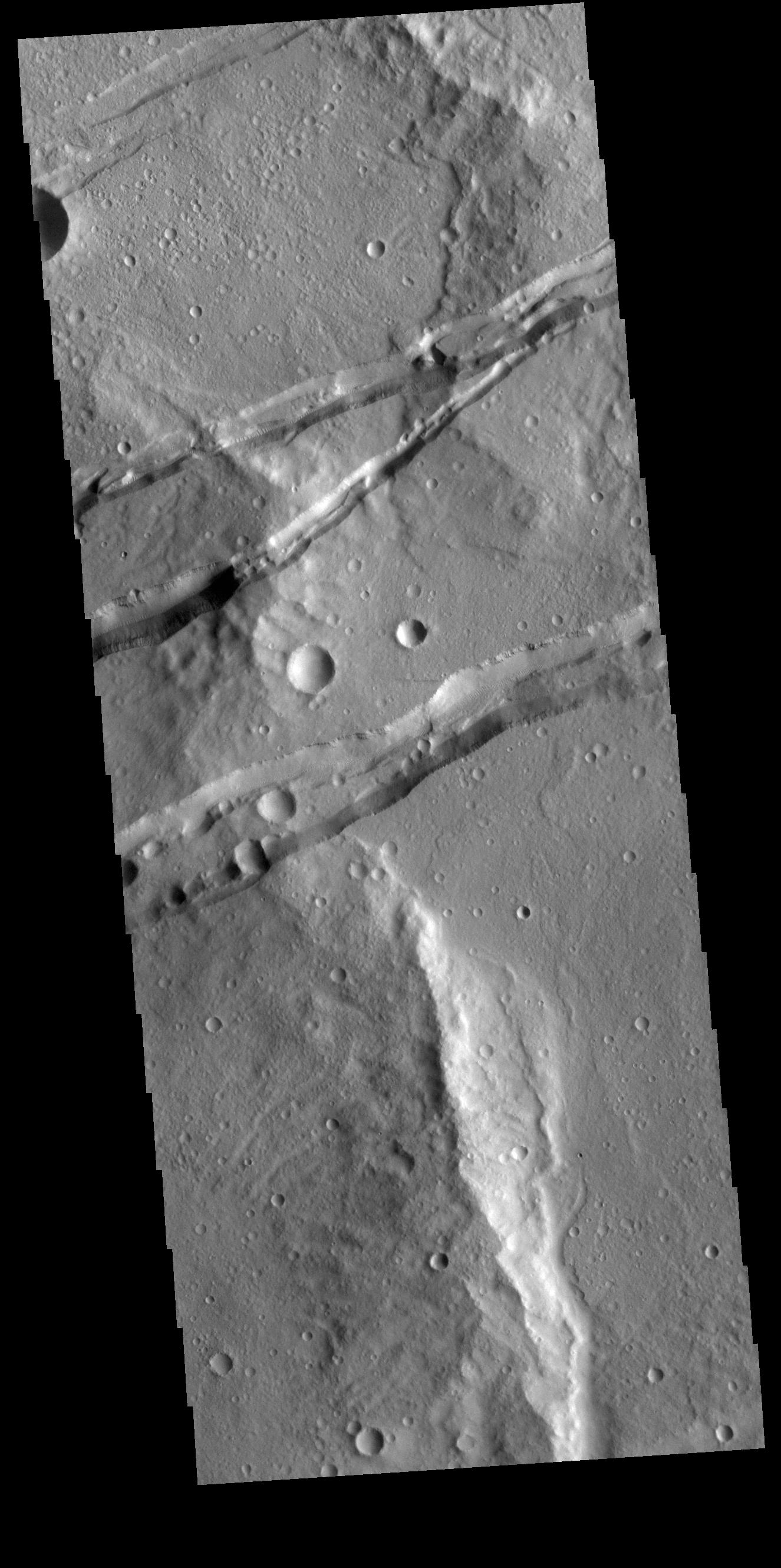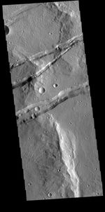The linear depressions in this VIS image are part of Sirenum Fossae. These depressions are called graben, which form by the down drop of material between two parallel faults. The faults are caused by extensional tectonic stresses in the region. The fossae are 2735km long (1700 miles).