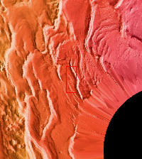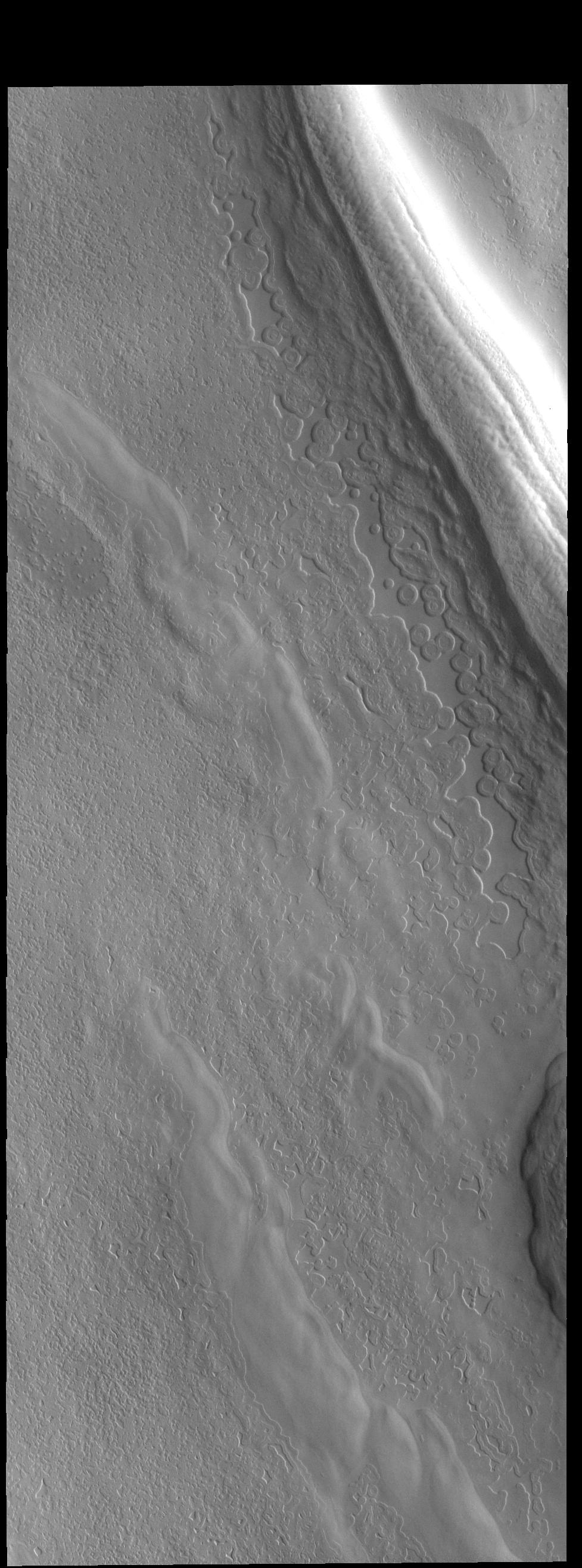 This VIS image shows part of a depression (or trough) on the polar cap.