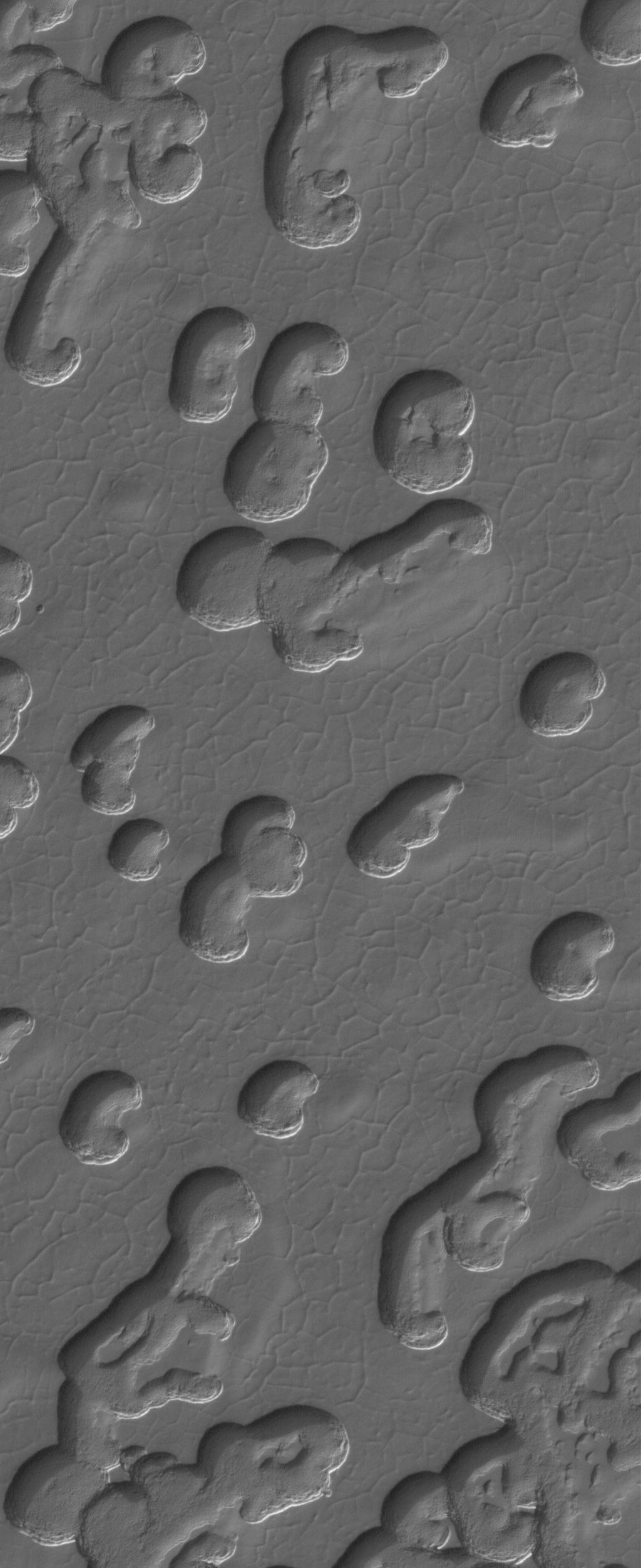 This Mars Global Surveyor (MGS) Mars Orbiter Camera (MOC) image shows a polgyon-cracked surface, into which deep, somewhat kidney-bean-shaped pits have formed. These are landscapes of the martian south polar residual cap. This view was captured during May 2005.
