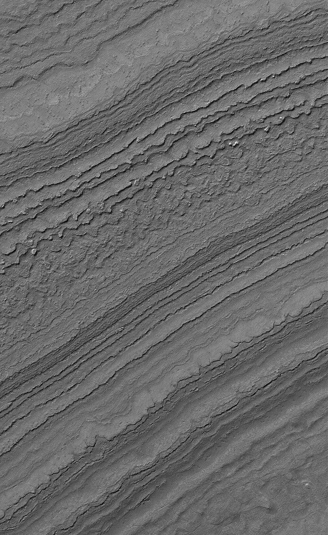 This Mars Global Surveyor (MGS) Mars Orbiter Camera (MOC) image shows layers exposed by erosion on a slope in the martian south polar region. Both polar caps on Mars are underlain by a complex stratigraphy of layered material; the Mars Polar Lander -- lost in December 1999 -- was designed to have provided some insight as to the nature and composition of the layers in the southern hemisphere.