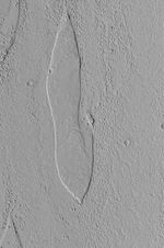 This Mars Global Surveyor (MGS) Mars Orbiter Camera (MOC) picture shows a streamlined island in Marte Vallis, a large outflow channel system that crosses the 180°W meridian between the Elysium and Amazonis regions of Mars. The flow patterns on the floor of Marte Vallis might be the remains of lava flows or mud flows. Marte is the Spanish word for Mars. Most of the largest valleys on the red planet are named for "Mars" in various languages. This island is located near 21.8°N, 175.3°W. The picture covers an area 3 km (1.9 mi) wide and is illuminated by sunlight from the lower left.