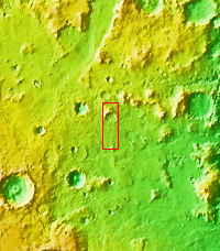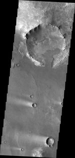 Today's VIS image shows a portion of northeastern Syrtis Major. In this image are several windstreaks and a lava flow that has entered the crater on the top of the image.