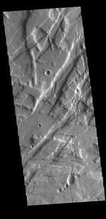 Today's VIS image is shows a small portion of Tempe Fossae. The linear features are tectonic graben. Graben are formed by extension of the crust and faulting. When large amounts of pressure or tension are applied to rocks on timescales that are fast enough that the rock cannot respond by deforming, the rock breaks along faults. In the case of a graben, two parallel faults are formed by extension of the crust and the rock in between the faults drops downward into the space created by the extension. This image is located in a region of Tempe Terra that is complexly fractured, with multiple crossing directions. The variety in trends indicates several different periods of tectonic activity. The complete fossae system in almost 2000 km (1242 miles) long.
