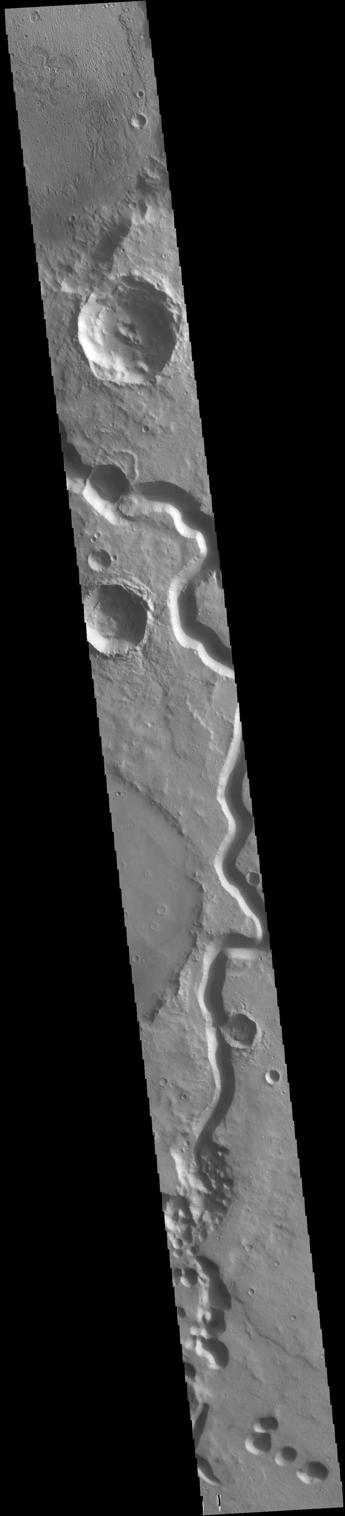 The sinuous channel in this VIS image is Tinto Vallis. This northward flowing channel is 180 km (112 miles) long and is located in northern Hesperia Planum. Tinto Vallis arises in the plains of Herperia Planum and empties into Palos Crater.
