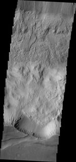 Two landslide deposits are visible in this image of Tithonium Chasma taken by NASA's 2001 Mars Odyssey spacecraft.