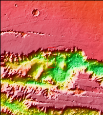 Today's VIS image shows the part of the northern side of Tithonium Chasma. Tithonium Chasma is at the western end of Valles Marineris. Valles Marineris is over 4000 kilometers long, almost as wide as the United States. Tithonium Chasma is almost 810 kilometers long (499 miles), 50 kilometers wide and over 6 kilometers deep. In comparison, the Grand Canyon in Arizona is about 175 kilometers long, 30 kilometers wide, and only 2 kilometers deep. The canyons of Valles Marineris were formed by extensive fracturing and pulling apart of the crust during the uplift of the vast Tharsis plateau. Landslides have enlarged the canyon walls and created deposits on the canyon floor. Weathering of the surface and influx of dust and sand have modified the canyon floor, both creating and modifying layered materials. The layered materials are at the bottom of the image, while a small landslide deposit can be seen in the center of the image.
