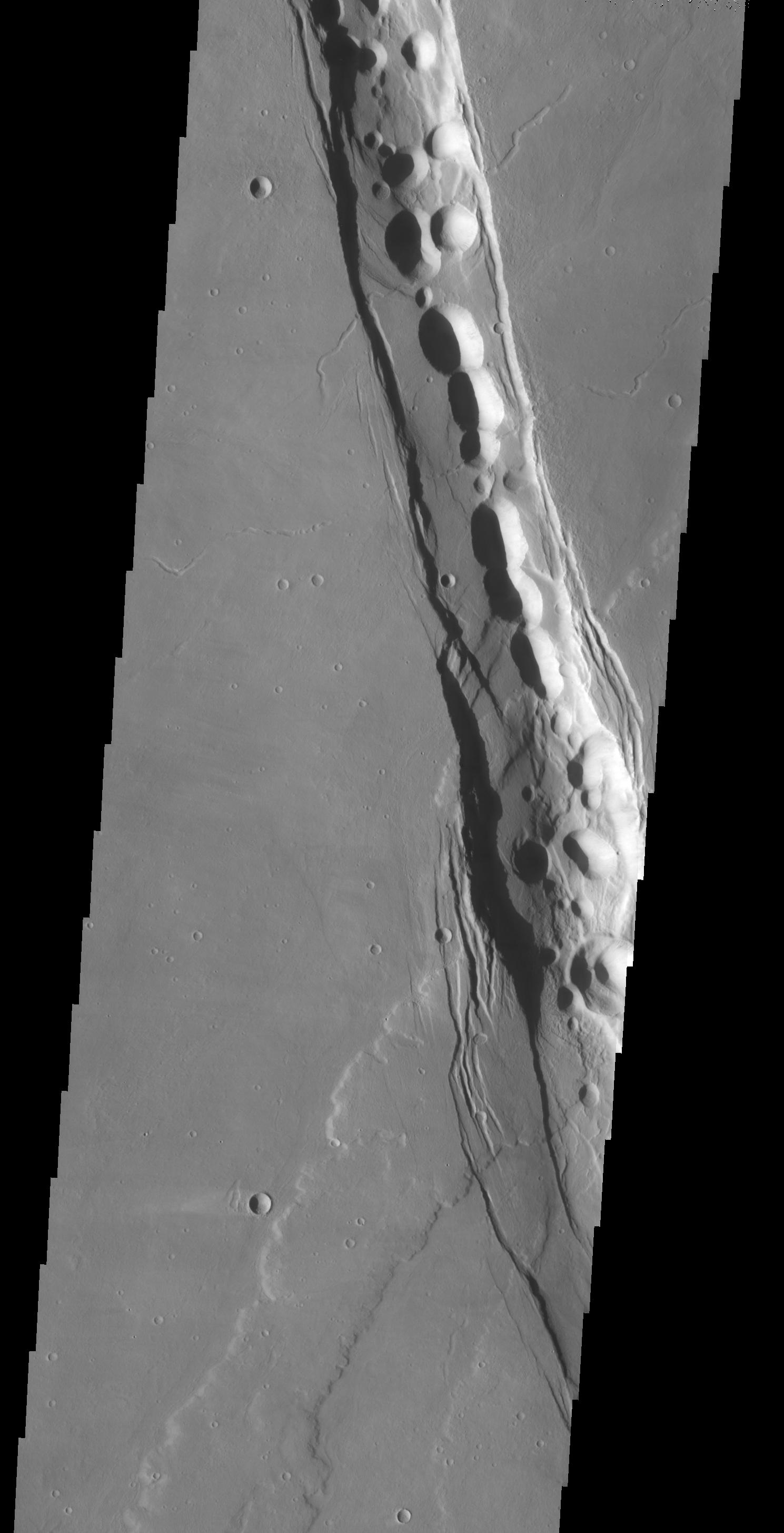 These collapse pits are found in graben located in Tractus Catena. These features are related to subsidence after magma chamber evacuation of Alba Patera.