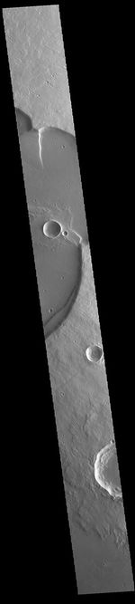 Today's VIS image shows the eastern side of Uranius Mons. Uranius Mons is 4.8 kilometers (3 miles) high with shallow slopes. The surrounding volcanic plains are younger than the volcano itself and originated at other volcanic centers in the Tharsis region.
