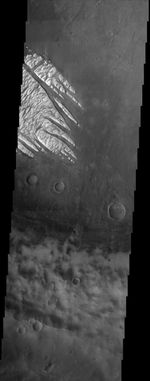 "White Rock" is the unofficial name for this unusual landform which was first observed during the Mariner 9 mission in the early 1970's. As later analysis of additional data sets would show, White Rock is neither white nor dense rock. Its apparent brightness arises from the fact that the material surrounding it is so dark. Images from the Mars Global Surveyor MOC camera revealed dark sand dunes surrounding White Rock and on the floor of the troughs within it. Some of these dunes are just apparent in the THEMIS image. Although there was speculation that the material composing White Rock could be salts from an ancient dry lakebed, spectral data from the MGS TES instrument did not support this claim. Instead, the White Rock deposit may be the erosional remnant of a previously more continuous occurrence of air fall sediments, either volcanic ash or windblown dust. The THEMIS image offers new evidence for the idea that the original deposit covered a larger area. Approximately 10 kilometers to the southeast of the main deposit are some tiny knobs of similarly bright material preserved on the floor of a small crater. Given that the eolian erosion of the main White Rock deposit has produced isolated knobs at its edges, it is reasonable to suspect that the more distant outliers are the remnants of a once continuous deposit that stretched at least to this location. The fact that so little remains of the larger deposit suggests that the material is very easily eroded and simply blows away.