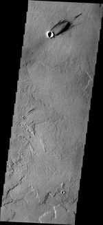 Note: this THEMIS visual image has not been radiometrically nor geometrically calibrated for this preliminary release. An empirical correction has been performed to remove instrumental effects. A linear shift has been applied in the cross-track and down-track direction to approximate spacecraft and planetary motion. Fully calibrated and geometrically projected images will be released through the Planetary Data System in accordance with Project policies at a later time.