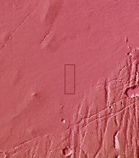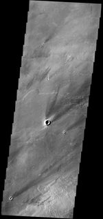 The windstreaks in this VIS image are located on the lava plains between Pavonis Mons and Noctis Fossae. Streaks form on the down wind side of positive topographic features (like hills and crater rims), indicating that the winds which created these streaks blew to the north east in this region.
