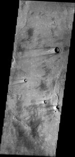 This image shows a portion of the Syrtis Major Planum. There are several windstreaks with the classic dark rim/bright interior appearance. Some of the windstreaks also have an additional dark streak oriented further southward than the main streaks. This indicates a change in wind regime in the region.