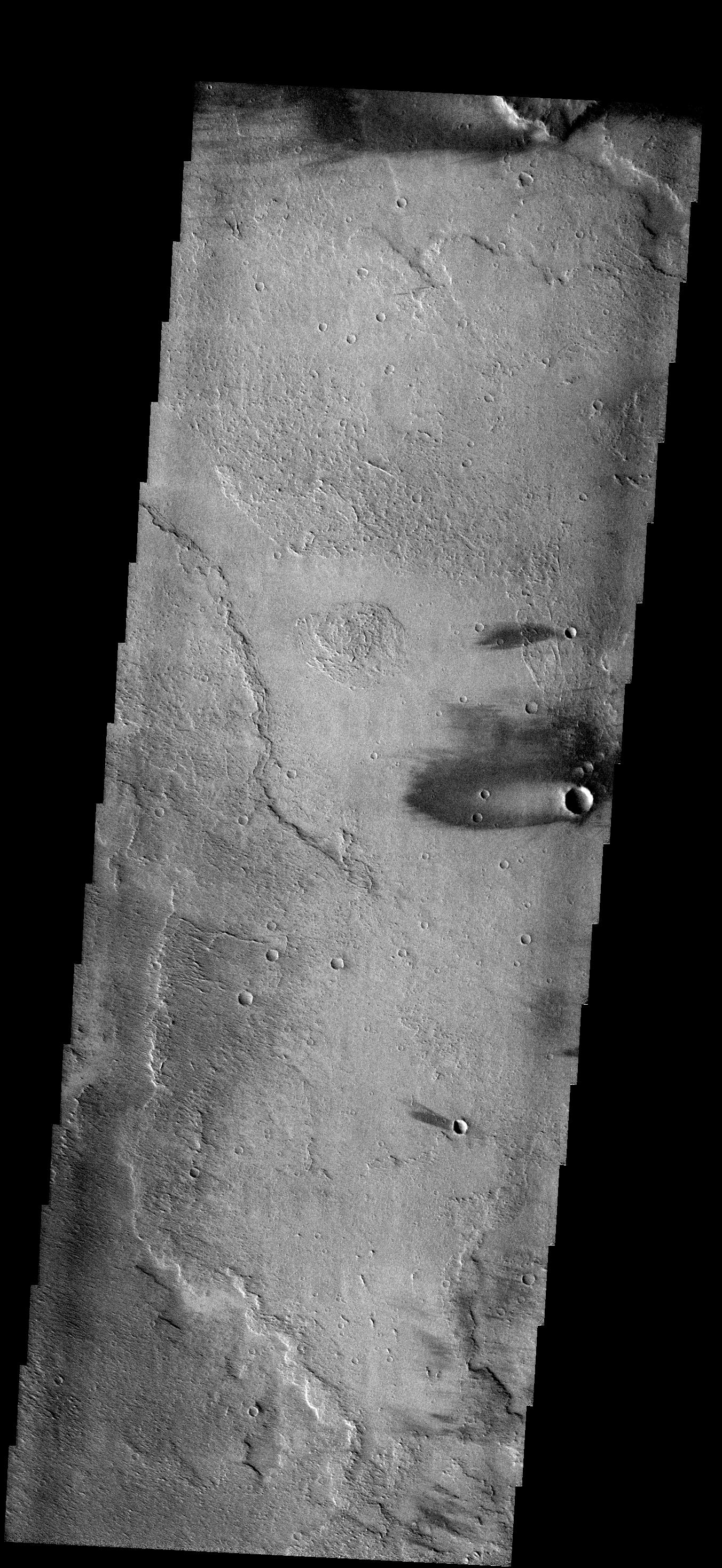Note: this THEMIS visual image has not been radiometrically nor geometrically calibrated for this preliminary release. An empirical correction has been performed to remove instrumental effects. A linear shift has been applied in the cross-track and down-track direction to approximate spacecraft and planetary motion. Fully calibrated and geometrically projected images will be released through the Planetary Data System in accordance with Project policies at a later time.