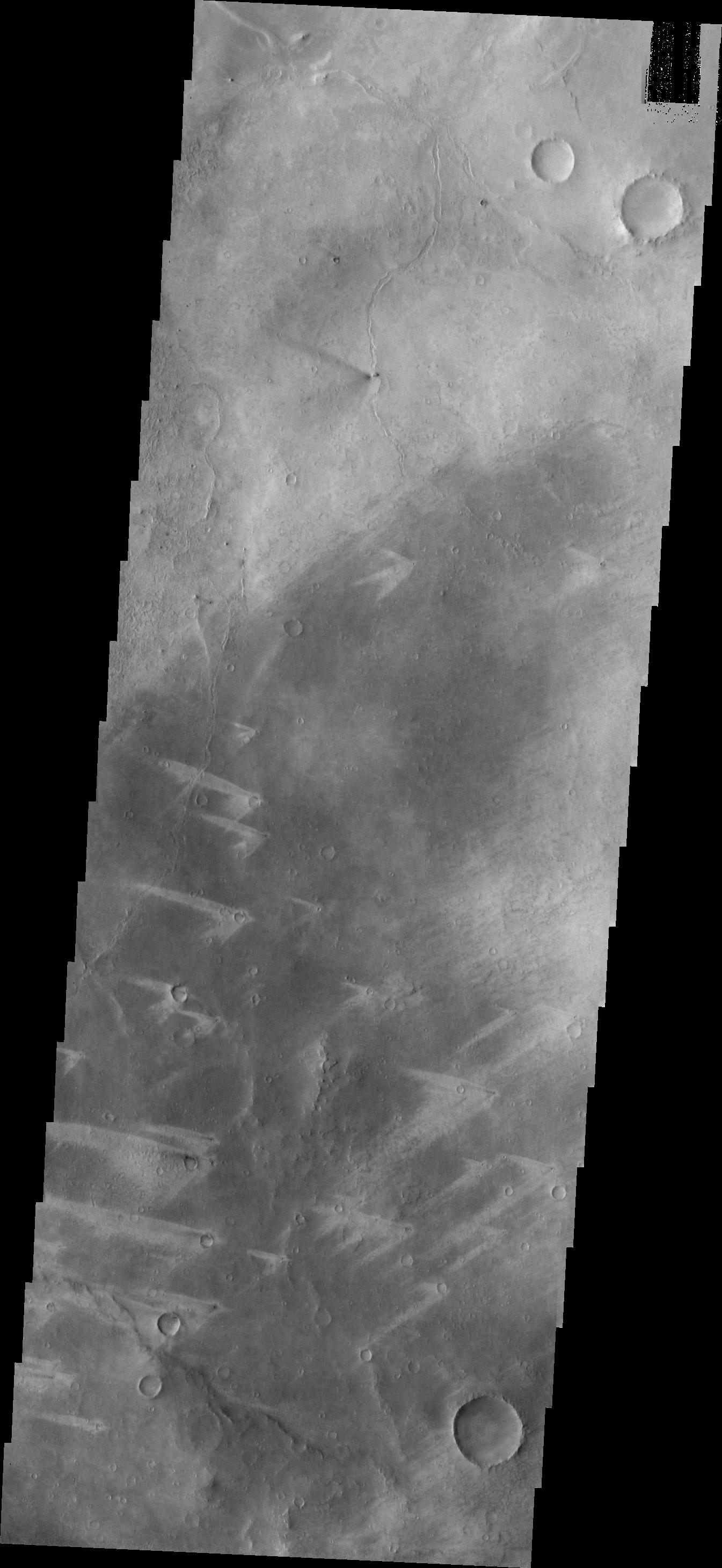 Note: this THEMIS visual image has not been radiometrically nor geometrically calibrated for this preliminary release. An empirical correction has been performed to remove instrumental effects. A linear shift has been applied in the cross-track and down-track direction to approximate spacecraft and planetary motion. Fully calibrated and geometrically projected images will be released through the Planetary Data System in accordance with Project policies at a later time.