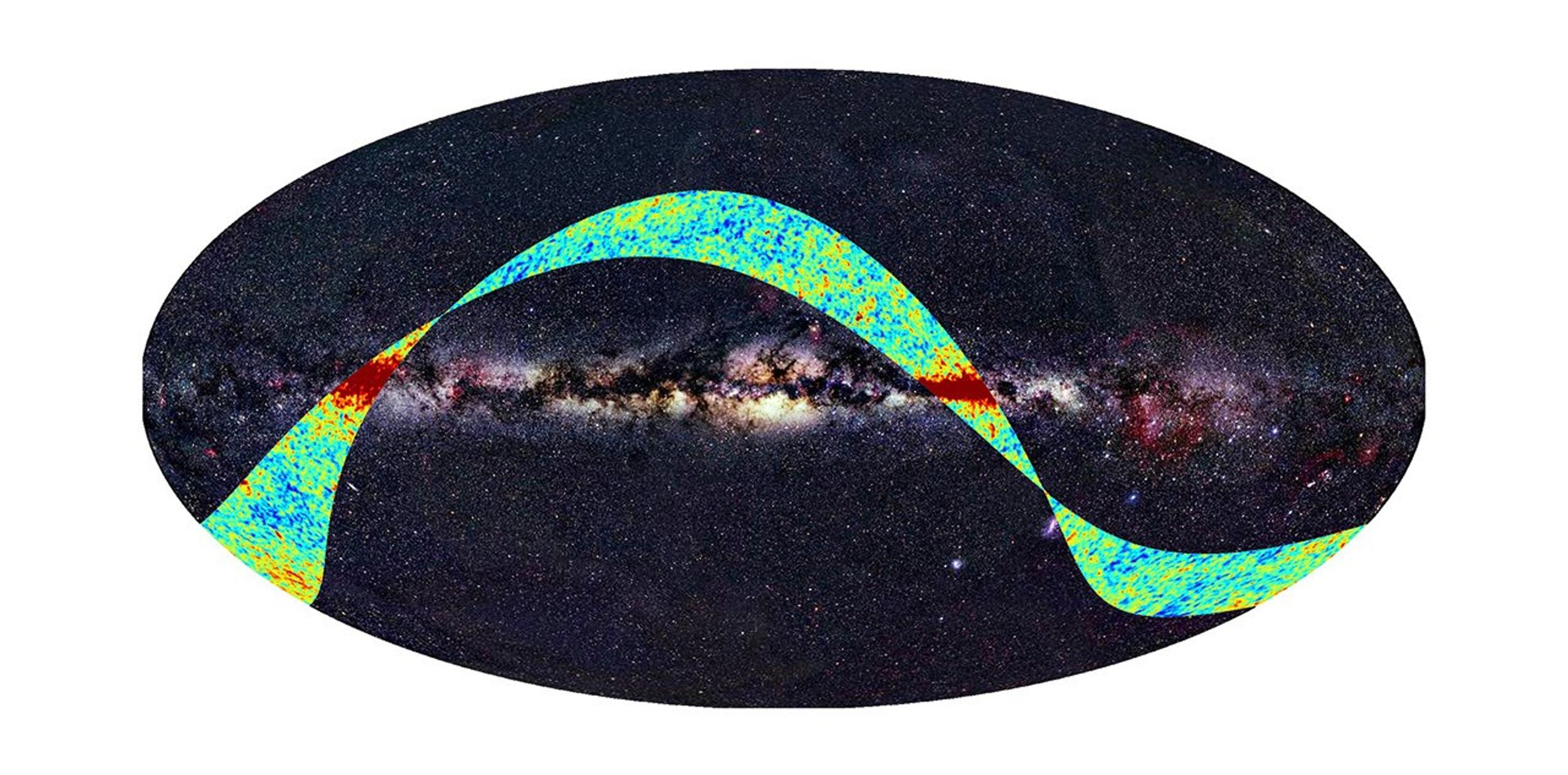 One of Planck's first images is shown as a strip superimposed over a two dimensional projection of the whole sky as seen in visible light. The strip covers 360-degrees of sky and, at its widest, is about 15 degrees across. The prominent horizontal band is light from our Milky Way galaxy.