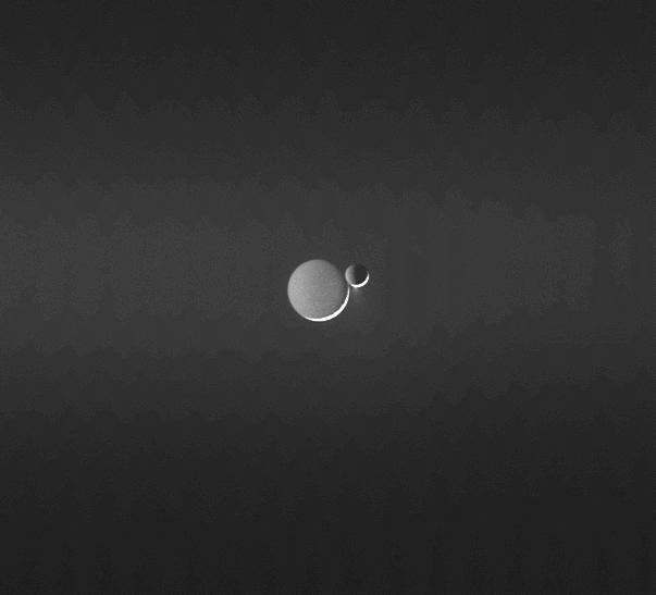 Two frigid moons, Rhea and Enceladus, shine in reflected light from Saturn. In such low light and at great distance, Rhea's cratered surface looks deceptively smooth. Light from the distant Sun creates the bright crescent on each moon and scatters off the icy spray above the south pole of Enceladus.