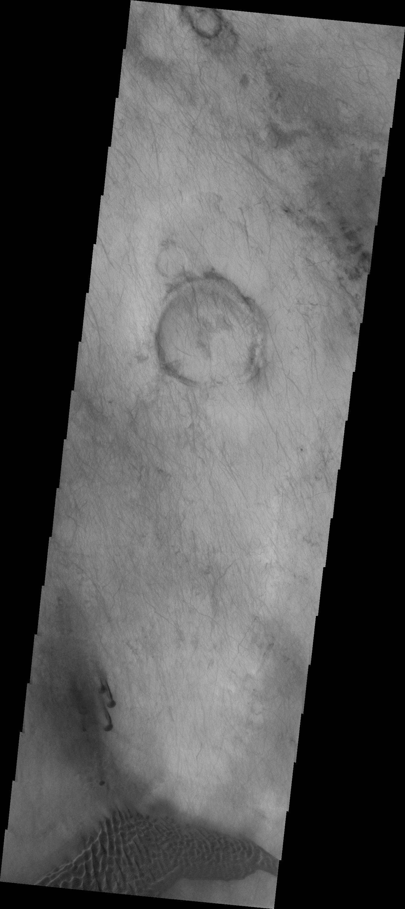 The dunes and dust devil tracks in this VIS image are located on the plains of Planum Chronium.