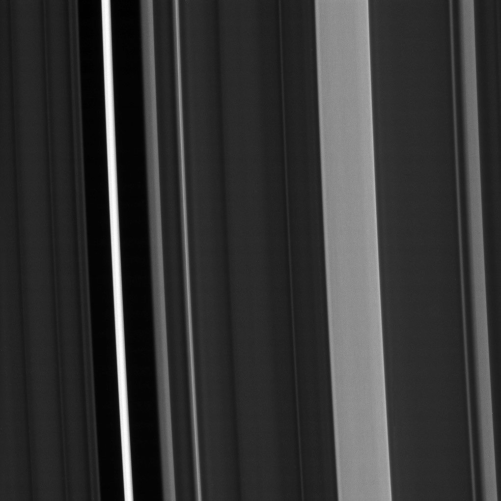 Saturn's C ring isn't uniformly bright. Instead, about a dozen regions of the ring stand out as noticeably brighter than the rest of the ring, while about half a dozen regions are devoid of ring material. Scientists call the bright regions "plateaus" and the devoid regions "gaps."