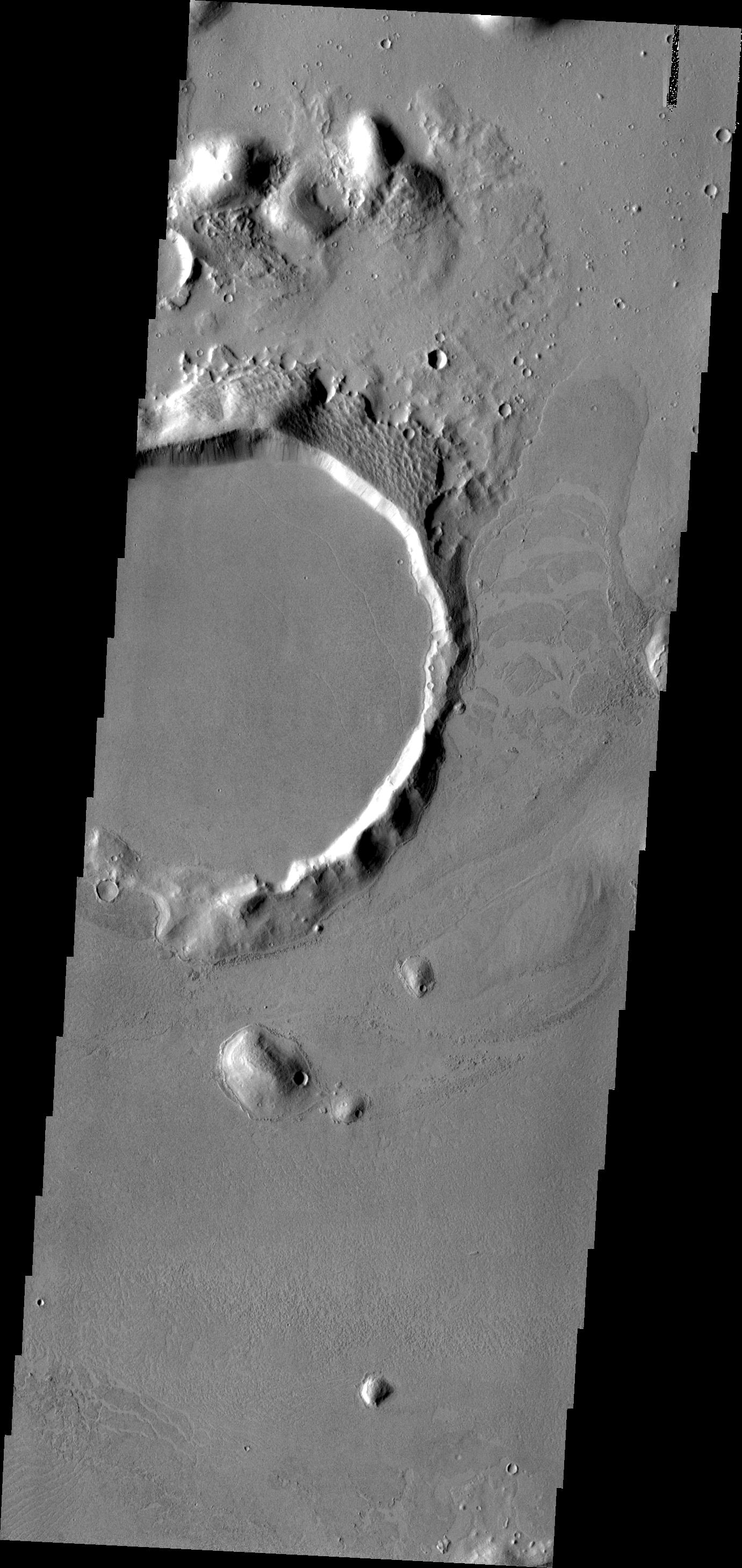 The 'tongue' of platy lava located on the eastern side of the crater and spilling towards the north is the margin of an extensive lava field within Amazonis Planitia.