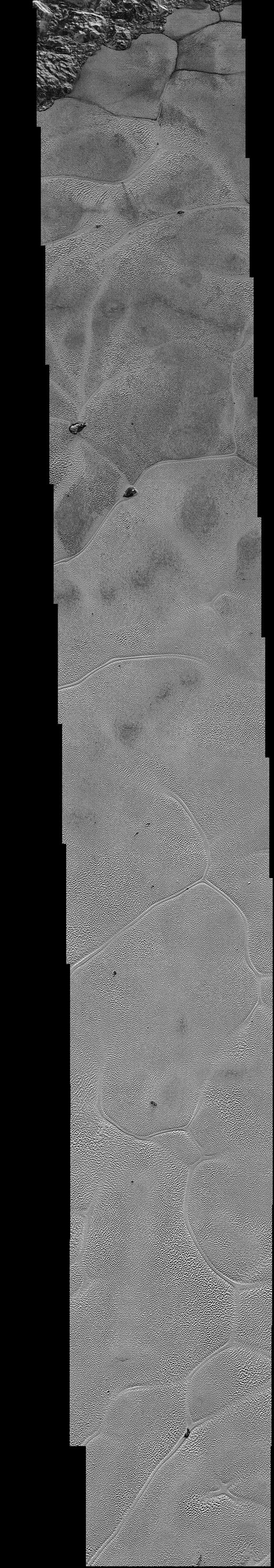 The pictures are part of a sequence taken near New Horizons' closest approach to Pluto, with resolutions of about 250-280 feet (77-85 meters) per pixel -- revealing features smaller than half a city block on Pluto's surface. The images shown here form a strip 50 miles (80 kilometers) wide and more than 400 miles (700 kilometers) long, trending from the northwestern shoreline of Sputnik Planum and out across its icy plains. The images illustrate the polygonal or cellular pattern of the plains, which are thought to result from the convective churning of a deep layer solid, but mobile, nitrogen ice.