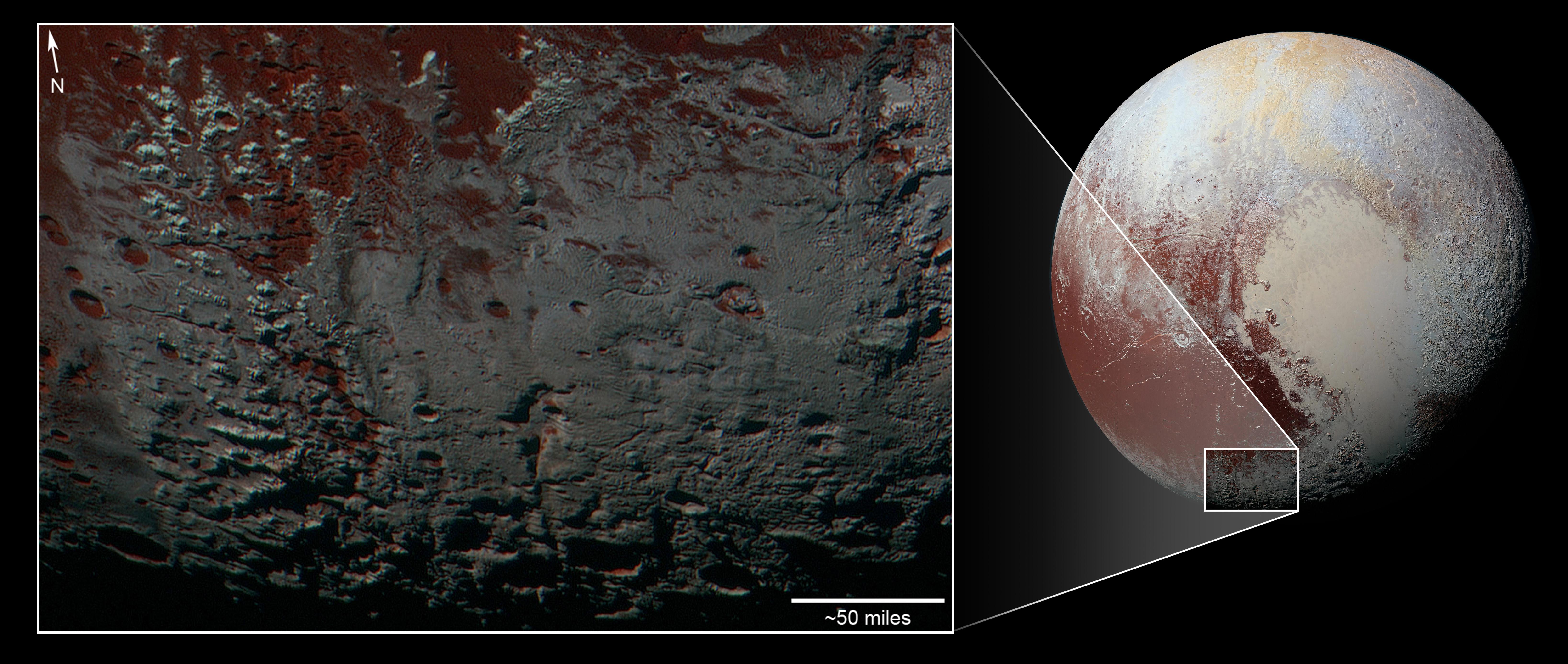 This enhanced color image was obtained by New Horizons' Multispectral Visible Imaging Camera (MVIC). The image resolution is approximately 2,230 feet (680 meters) per pixel. It was obtained at a range of approximately 21,100 miles (33,900 kilometers) from Pluto, about 45 minutes before New Horizons' closest approach to Pluto on July 14, 2015.