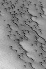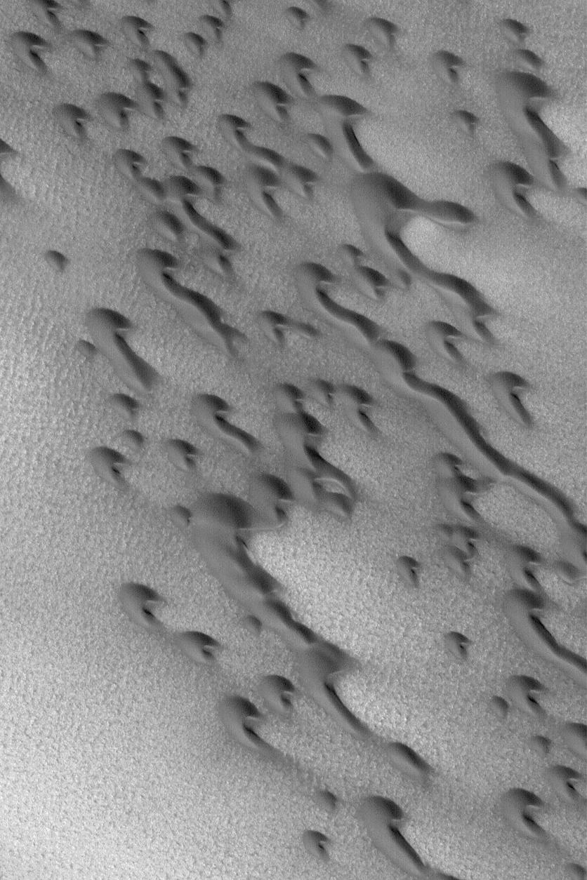 This Mars Global Surveyor (MGS) Mars Orbiter Camera (MOC) image shows dark, barchan sand dunes of the north polar region of Mars. Barchan dunes are simple, rounded forms with two horns that extend downwind. Inequalities in local wind patterns may result in one horn being extended farther than the other, as is the case for several dunes in this image. The image also shows several barchans may merge to form a long dune ridge. The horns and attendant slip faces on these dunes indicate wind transport of sand from the upper left toward the lower right. The image is located near 77.6°N, 103.6°W. The picture covers an area about 3 km (1.9 mi) wide; sunlight illuminates the scene from the lower left.