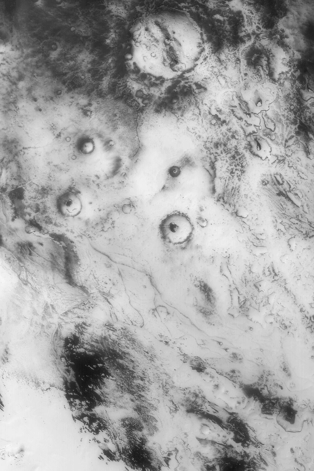 This red wide angle Mars Global Surveyor (MGS) Mars Orbiter Camera (MOC) image shows a view of the retreating seasonal south polar cap in the most recent spring in late 2003. Bright areas are covered with frost, dark areas are those from which the solid carbon dioxide has sublimed away. The center of this image is located near 76.5°S, 28.2°W. The scene is large; it covers an area about 250 km (155 mi) across. The scene is illuminated by sunlight from the upper left.