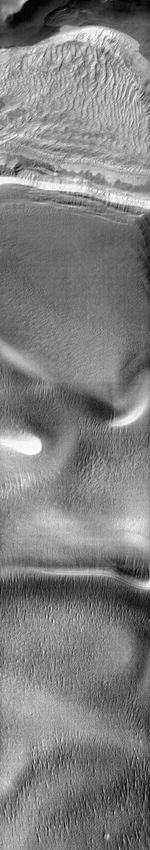 A large sand sheet with surface dune forms is located on the floor of this crater near the south pole. The polar cap rests against the southern part of the sand sheet. The dune appears bright in this daytime IR image, as the sand is warmer than the nearby polar ice.