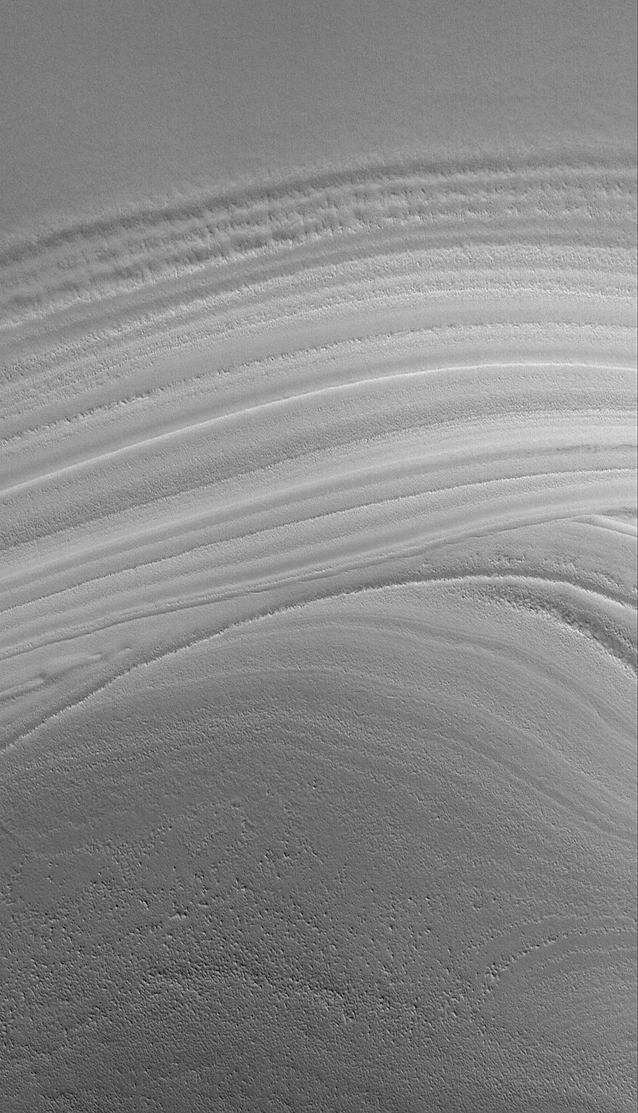 This Mars Global Surveyor (MGS) Mars Orbiter Camera (MOC) image shows an unconformity in a sequence of layered material in the martian north polar region. MGS MOC has been examining many similar examples of unconformities created by erosion in the polar region this year. Long ago, the lower set of layers was deposited. Then, deposition ceased, and erosion occurred for some period. Then, the erosional period ended, and new layers were deposited. The older layers -- the ones deposited before the erosive event -- today appear truncated by the younger, more evenly-bedded layers. No one is certain what composes the north polar layers; they may be sequences of dust and ice.