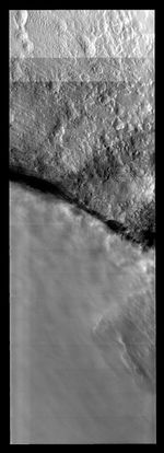 Note: this THEMIS visual image has not been radiometrically nor geometrically calibrated for this preliminary release. An empirical correction has been performed to remove instrumental effects. A linear shift has been applied in the cross-track and down-track direction to approximate spacecraft and planetary motion. Fully calibrated and geometrically projected images will be released through the Planetary Data System in accordance with Project policies at a later time.