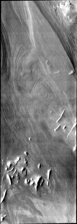 Note: this THEMIS visual image has not been radiometrically nor geometrically calibrated for this preliminary release. An empirical correction has been performed to remove instrumental effects. A linear shift has been applied in the cross-track and down-track direction to approximate spacecraft and planetary motion. Fully calibrated and geometrically projected images will be released through the Planetary Data System in accordance with Project policies at a later time.