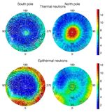 Observations by NASA's 2001 Mars Odyssey spacecraft show views of the polar regions of Mars in thermal neutrons (top) and epithermal neutrons (bottom). In these maps, deep blue indicates a low amount of neutrons, and red indicates a high amount. Thermal neutrons are sensitive to the presence of hydrogen and the presence of carbon dioxide, in this case "dry ice" frost. The red area in the upper right map indicates that about one meter (three feet) of carbon dioxide frost covers the surface around the north pole, as it does every Mars winter in the polar regions. An enhancement of thermal neutrons close to the south pole, seen as a light green color on the upper left map, indicates the presence of residual carbon dioxide in the south polar cap, even though the annual frost dissipated from that region during southern summer. Soil enriched with hydrogen is indicated by the deep blue colors on the epithermal maps (bottom), showing a low intensity of epithermal neutrons. The deep blue areas in the polar regions are believed to contain up to 50 percent water ice in the upper one meter (three feet) of the soil. The views shown here are of measurements made during the first three months of mapping using the neutron spectrometer instrument, part of the gamma ray spectrometer instrument suite. Topographic features are superimposed on the map for geographic reference.