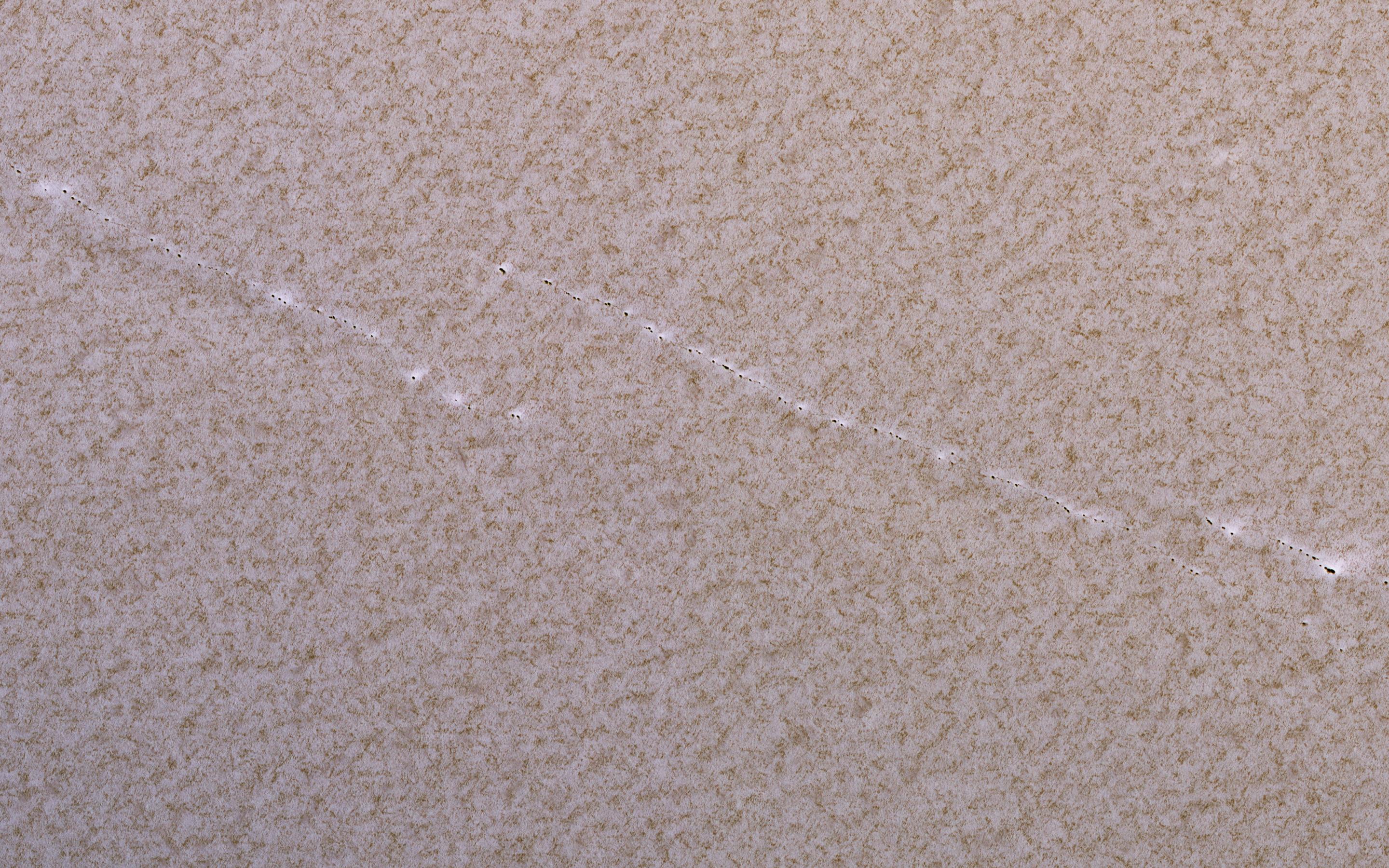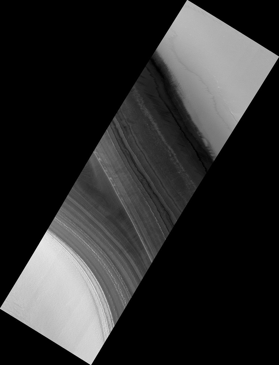 This 2008 image shows a portion of the North Polar layered deposits with lines of very small pits, only about 1 meter in diameter.
