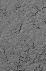 This Mars Global Surveyor (MGS) Mars Orbiter Camera (MOC) image shows eroding mesas of frozen carbon dioxide in the martian south polar residual cap. During the summer season, the scarps that bound each pit and mesa in the south polar region become dark as carbon dioxide sublimes away. The darkening might result from the roughening of the surfaces from which ice is subliming, or from the concentration of trace amounts of dust on these slopes, or both.