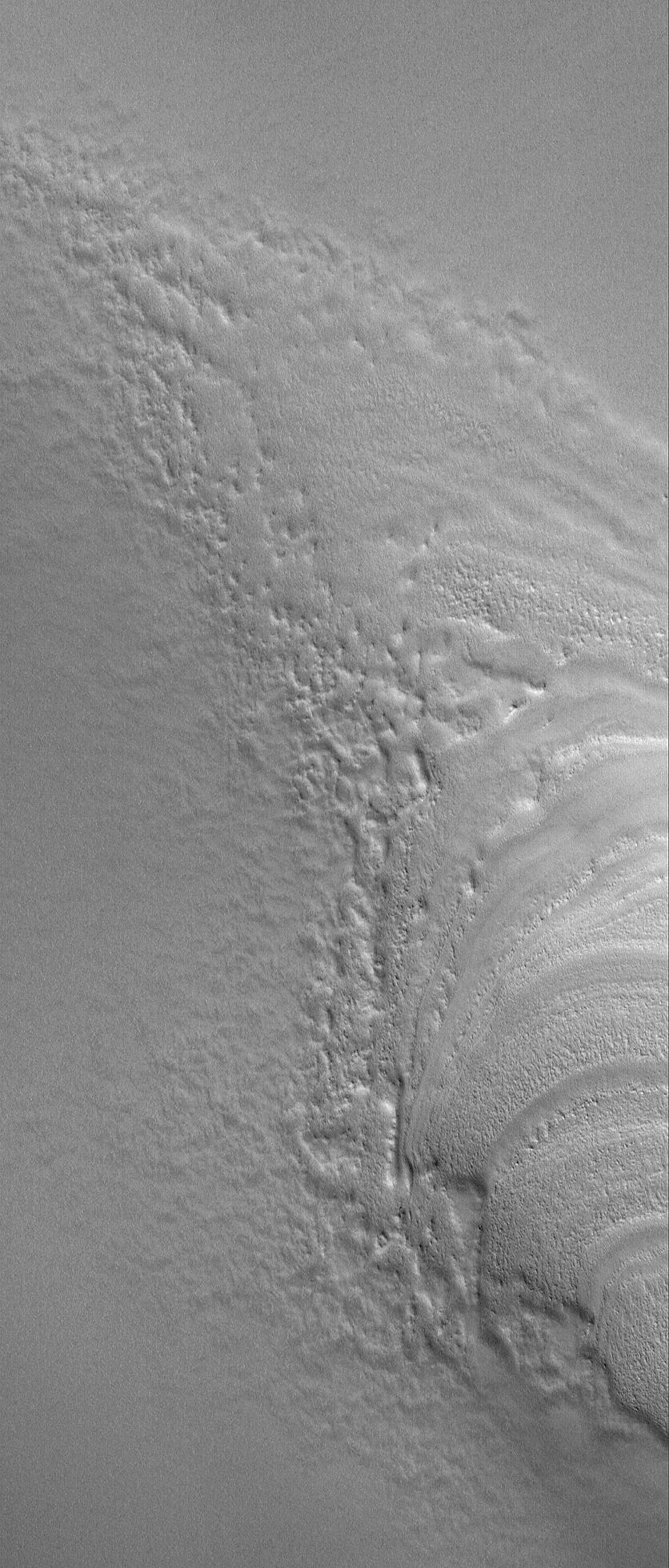 This Mars Global Surveyor (MGS) Mars Orbiter Camera (MOC) image shows the termination (end) of a group of layers in the north polar region of Mars, where they have been buried by younger, smoother-surfaced material. The layers are the banded features at the right/lower right. They are emerging by erosion from beneath the smoother material that dominates the scene. As the smooth material erodes, its margins become rough and rugged. No one knows the composition of the layered materials of the north polar region; most believe that they are a mixture of various proportions of ice, dust, and in some places, sand.