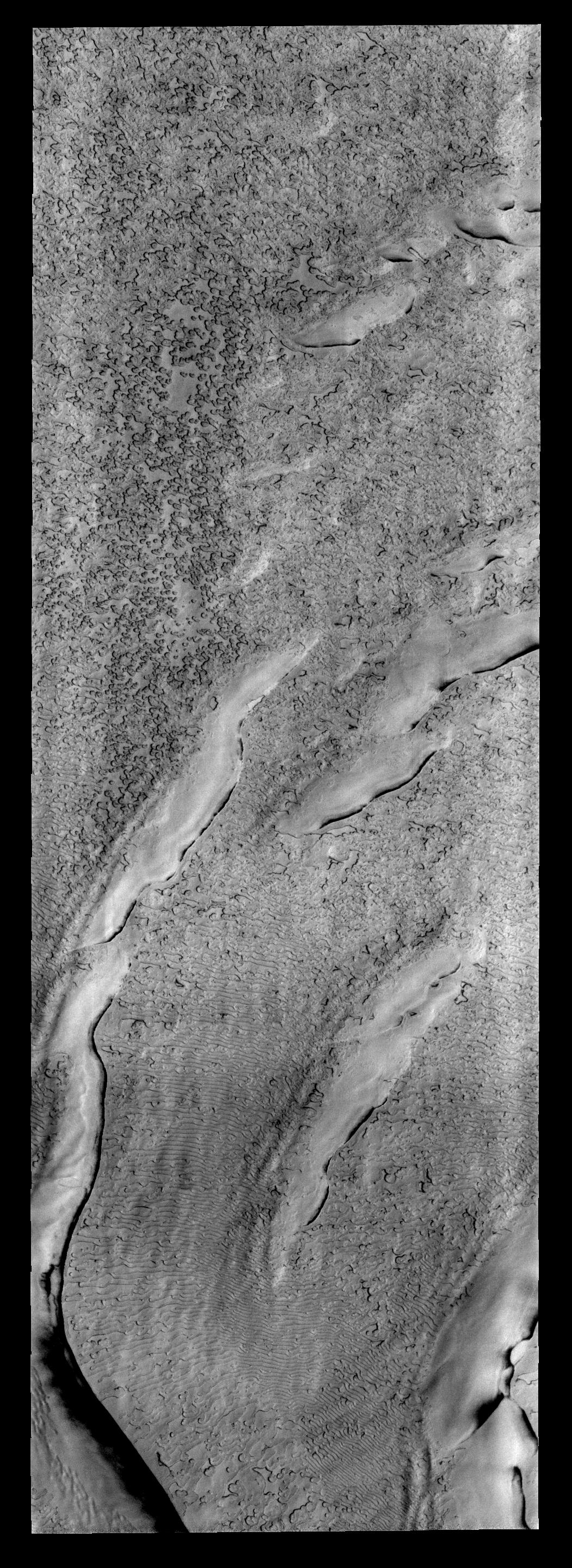 The "holey" texture of the image of the North Polar cap is called "swiss-cheese," while the linear texture at the bottom of the frame is called "thumbprint terrain."