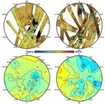These polar maps show the first global, topographic mapping of Saturn's moon Titan, using data from NASA's Cassini mission. To create these maps, scientists employed a mathematical process called splining, which uses smooth curved surfaces to "join" the areas between grids of existing topography profiles obtained by Cassini's radar instrument. The topography maps at bottom focus on the polar regions (north at left, south at right) in stereographic projection. The top maps show the 2-D radar data in gold and black, with topography data color-coded by elevation. The bottom images are from the new topography map, with contour lines added at 656 feet (200 meters) apart in elevation.
