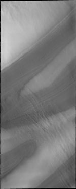 North polar troughs are the typical location to see evidence of strong polar surface winds. This VIS image shows 'streamers' of clouds created by catabatic winds. Catabatic winds are created by cold air sinking at the pole and then speeding along the surface towards the edge of the polar cap. When the wind enters troughs the wind regime changes from laminar flow to choatic and clouds of ice particles or dust are visible.
