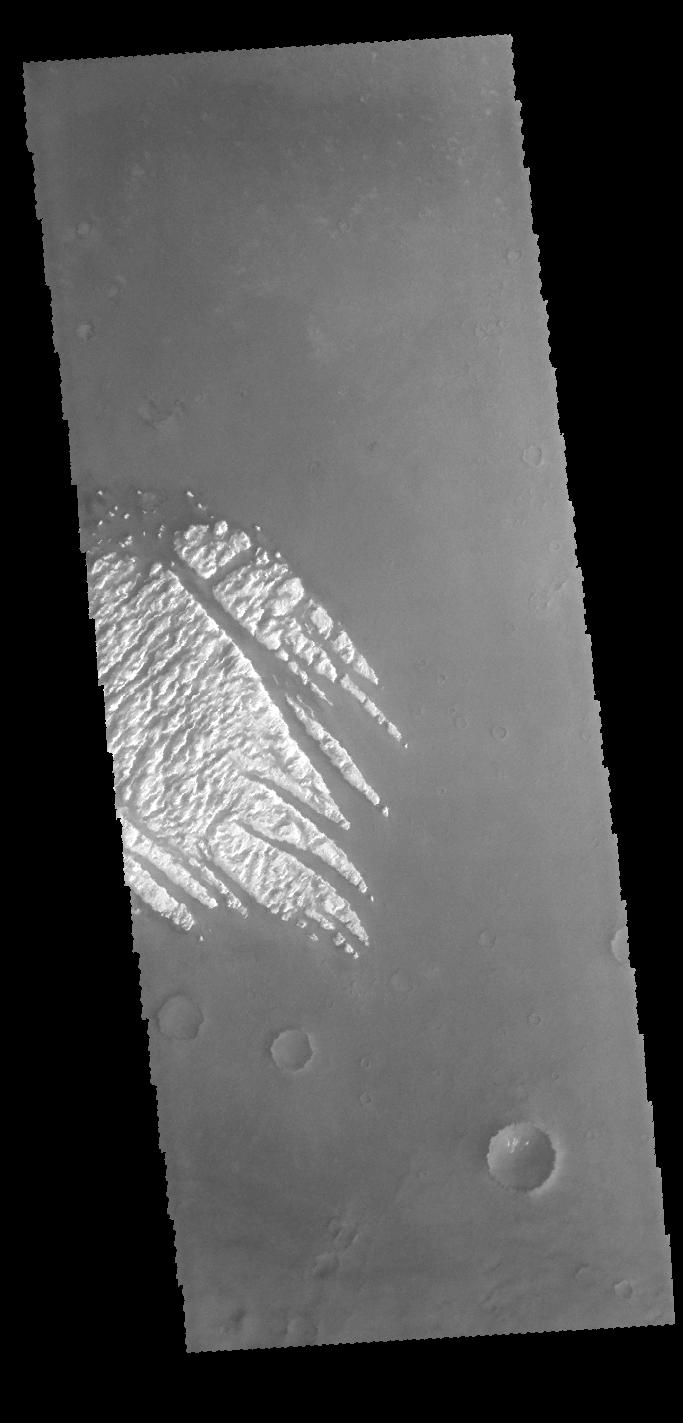 This VIS image shows part of the bright material on the floor of Pollack Crater. Erosion by wind action has sculpted the material, forming the linear features that run from bottom right to upper left. The material, while brighter in contrast than the surrounding materials, is not white.