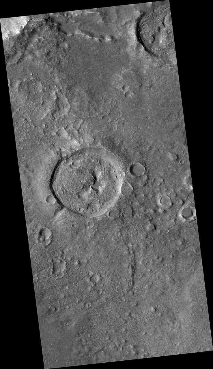 This small crater was probably once filled with an ice-covered lake that overflowed, forming the exit channel. Young craters with exit channels are intriguing because they record a relatively recent (during the Amazonian epoch) wet environment on Mars.