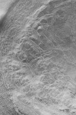 This August 2003 Mars Global Surveyor (MGS) Mars Orbiter Camera (MOC) image shows polygon patterns, enhanced by frost in the cracks that outline the polygon forms, in the south polar region of Mars. On Earth, patterns such as this usually indicate the presence of ice in the subsurface. The same might be true for Mars. This picture is located near 70.6°S, 309.5°W, and covers an area 3 km (1.9 mi) wide. The image is illuminated by sunlight from the upper left.